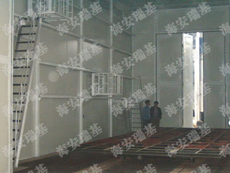 干式噴漆房的室體以鋼結(jié)構(gòu)支架壁板和玻璃墻板于一體,室體前端設(shè)有工件進(jìn)出通道,側(cè)面設(shè)有大型采光玻璃窗,室內(nèi)寬敞明亮。室體的上部設(shè)有被動(dòng)進(jìn)風(fēng)過濾層,使空氣按層流狀態(tài)均勻的進(jìn)入噴漆室內(nèi)。室體頂部的終效過濾層由一塊塊過濾板組合而成,在噴漆室頂部可以很方便地拆裝和清理。